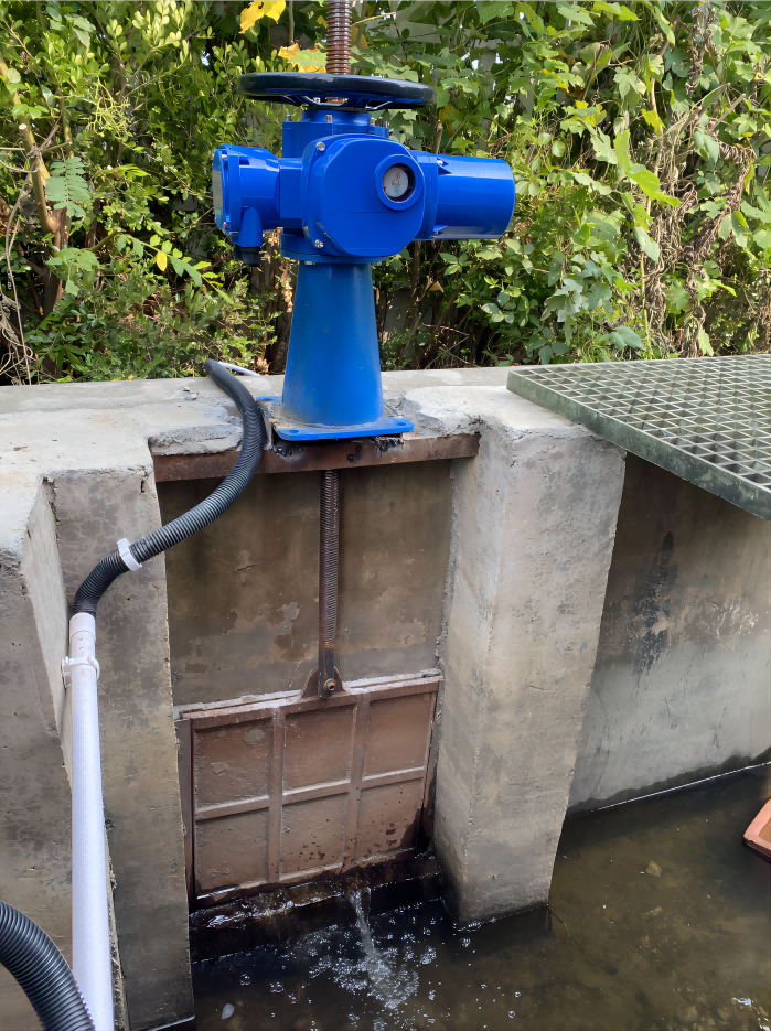 此处为手动圆盘式闸阀,改造需要把闸杆更换加装电机,改造闸门可以远程联动控制启闭。三个闸阀共用一个控制柜,节省成本,方便管理,安装在泵房内,不易破坏。泵房内,两台25kw的水泵控制直接启动,为实现自动化及保护水泵,采用软启动控制柜,更稳定,不容易出故障。