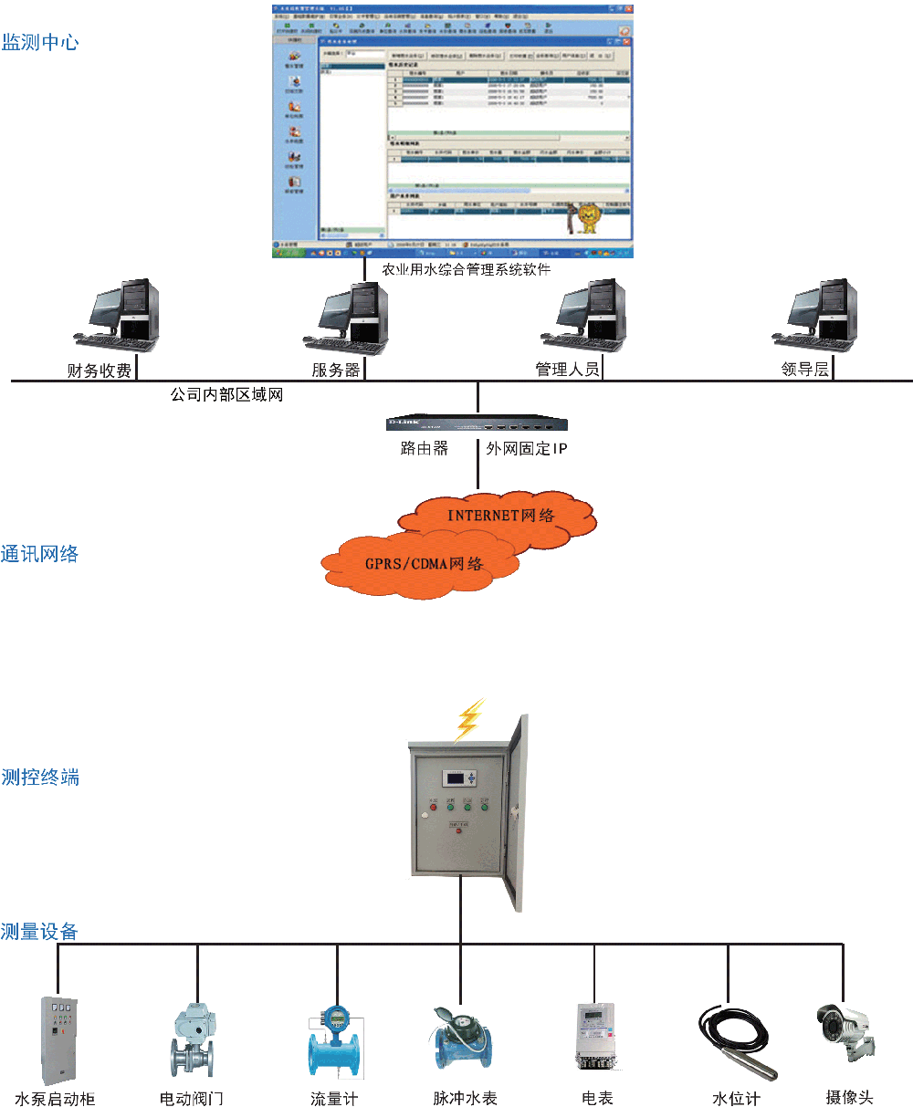 一、系统简介 农业用水综合管理系统中机井灌溉IC卡收费控制是该系统的核心,它将机井灌溉控制器、交流接触器以及配电设备安装在一个机箱内,可以采集灌溉用电量、用水量或灌溉时间并自动收取灌溉费用。农田机井灌溉收费控制箱不仅使管理部门实现了先收费、后灌溉的管理目标;也使农户达到了借助IC卡自主浇地的目的。同时也成功解决了农业机井灌溉管理中长期存在的电费/水费计量不准、拖欠灌溉费用和浪费水资源的难题。 二、系统组成 v 监控中心:中心服务器、外网固定IP、水资源管理系统软件、收费管理系统软件; v 通信网络: 基于移动无线GPRS或电信无线CDMA网络; v 采集控制终端:IC卡控制终端、GPRS/CDMA DTU; v 计量仪表:流量计/水表/电表、水泵控制柜/电动阀门。